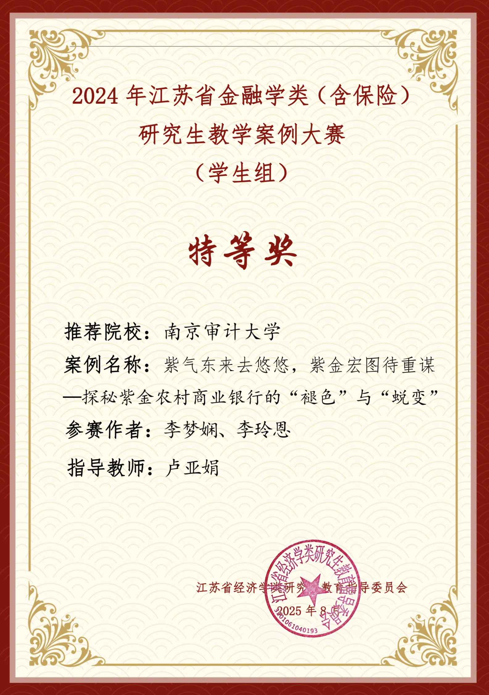 近日,江苏省经济学类研究生教育指导委员会公布了2024 年江苏省金融学类(含保险)研究生教学案例大赛(学生组)评审结果,我院9位研究生指导教师指导学生撰写的15篇案例在本次大赛中获奖,取得了不俗的成绩,其中:特等奖1项、一等奖2项、二等奖3项目、三等奖5项、优秀奖4项。卢亚娟教授指导的研究生李梦娴、李玲恩撰写的案例《紫气东来去悠悠,紫金宏图待重谋—探秘紫金农村商业银行的“褪色”与“蜕变”》获得案例大赛特等奖,孙杨教授指导的研究生汤佳佳撰写的案例《亚太所 “大厦将倾”,地方城投审计之殇何解?》与刘妍教授指导的研究生盛洁撰写的案例《豪情渐隐去,从容赴新程:中国平安房地产投资策略的转型漫道》分别获得案例大赛一等奖