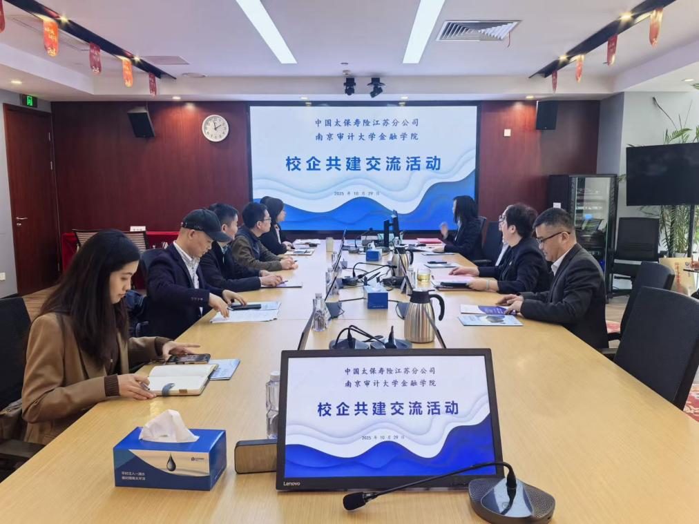 2025年10月29日下午,南京审计大学金融学院与中国太平洋人寿保险股份有限公司江苏分公司围绕产教融合、校企共建开展专项访企拓岗专项工作。金融学院党委副书记单德伟、风保系主任罗琰、贺超飞老师,专职辅导员刘斐老师及八位研究生和本科生,与太保寿险险江苏分公司资深副总经理马维莉,党委组织部部长及人力资源部总经理周旭东,市场企划部总经理龚亮,人力资源部高专兼人才发展室经理成烨,南审优秀校友鞠蔚、王玥、吴琼、朱家玉,及其他参会代表进行了深入的交流。
