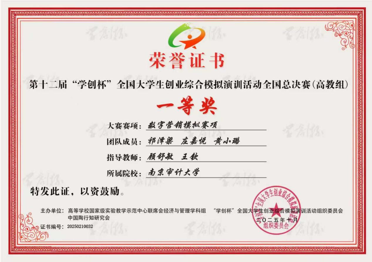 在备受关注的数字营销模拟赛项中,由南京审计大学金融学院顾舒敏等老师的精心指导,由祁泽梁、庄嘉悦、黄小璐三位同学组成的参赛队伍,凭借扎实的专业知识、创新的营销策略、默契的团队配合与稳定的临场表现,一路过关斩将,最终脱颖而出,荣获该赛项国家一等奖,充分展现了南审金融学子的卓越风采与创新活力。