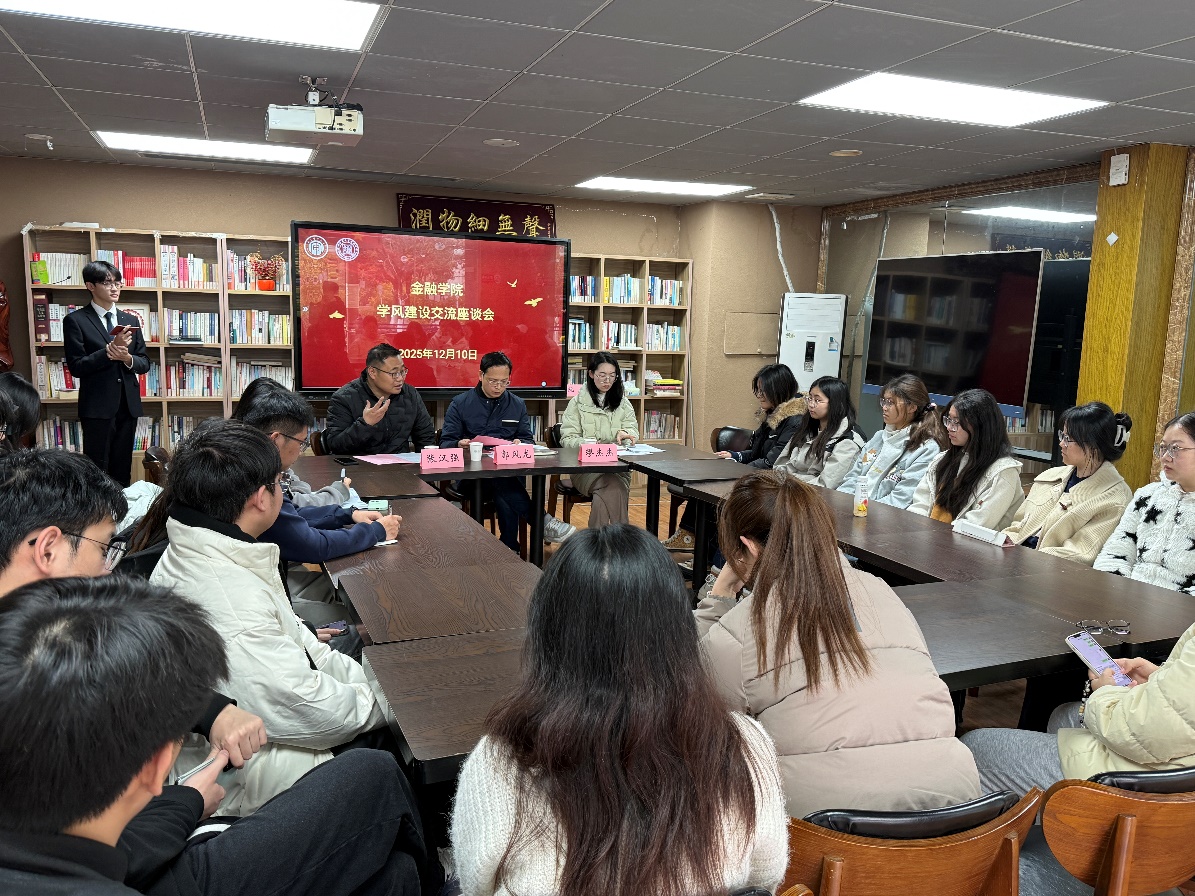为强化学风建设,营造奋发向上的学习氛围,精准回应同学们在学习中的难点与诉求,金融学院于2025年12月10日下午在润园书院文化长廊403会议室举行“学在金融,风正扬帆”学风建设交流座谈会。金融工程系主任郭风龙、学生工作办公室主任张汉强、辅导员缪杰杰以及各班学习委员、学生会学习部成员共同参会。