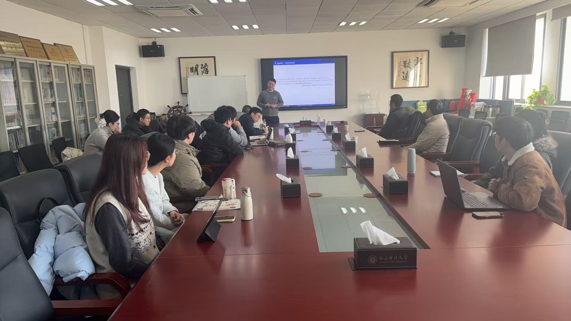 在互动环节,与会教师围绕央行数字货币的发展脉络、国际实践比较、模型设定与政策含义等话题,与贾老师展开深入探讨。贾鹏飞副教授还结合自身研究经验,分享了数字货币领域的前沿动态、OLG模型在货币经济学中的应用,以及高水平学术论文的撰写与发表心得,为在座青年教师及研究生提供了极具启发性的研究思路与方法指导。