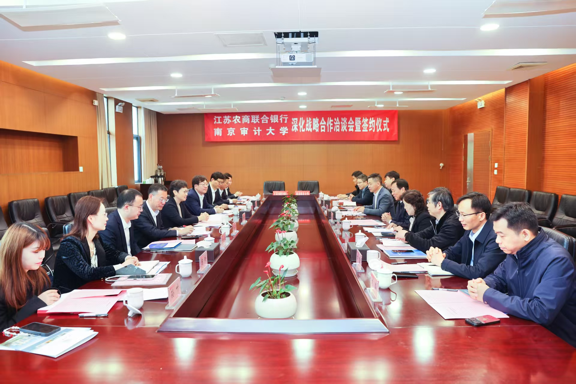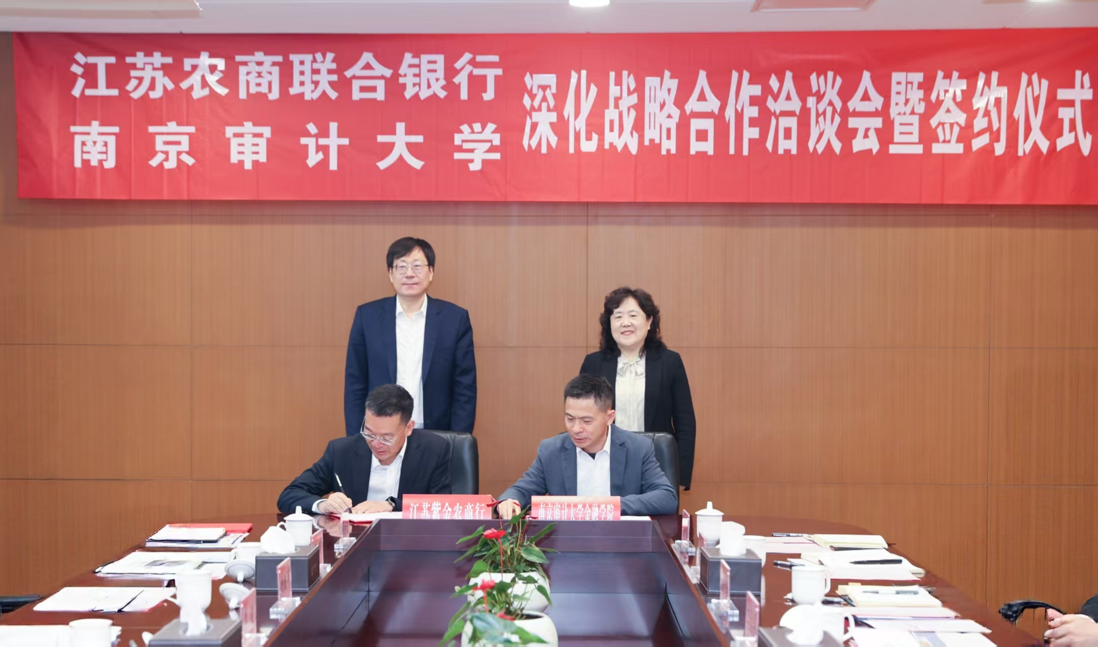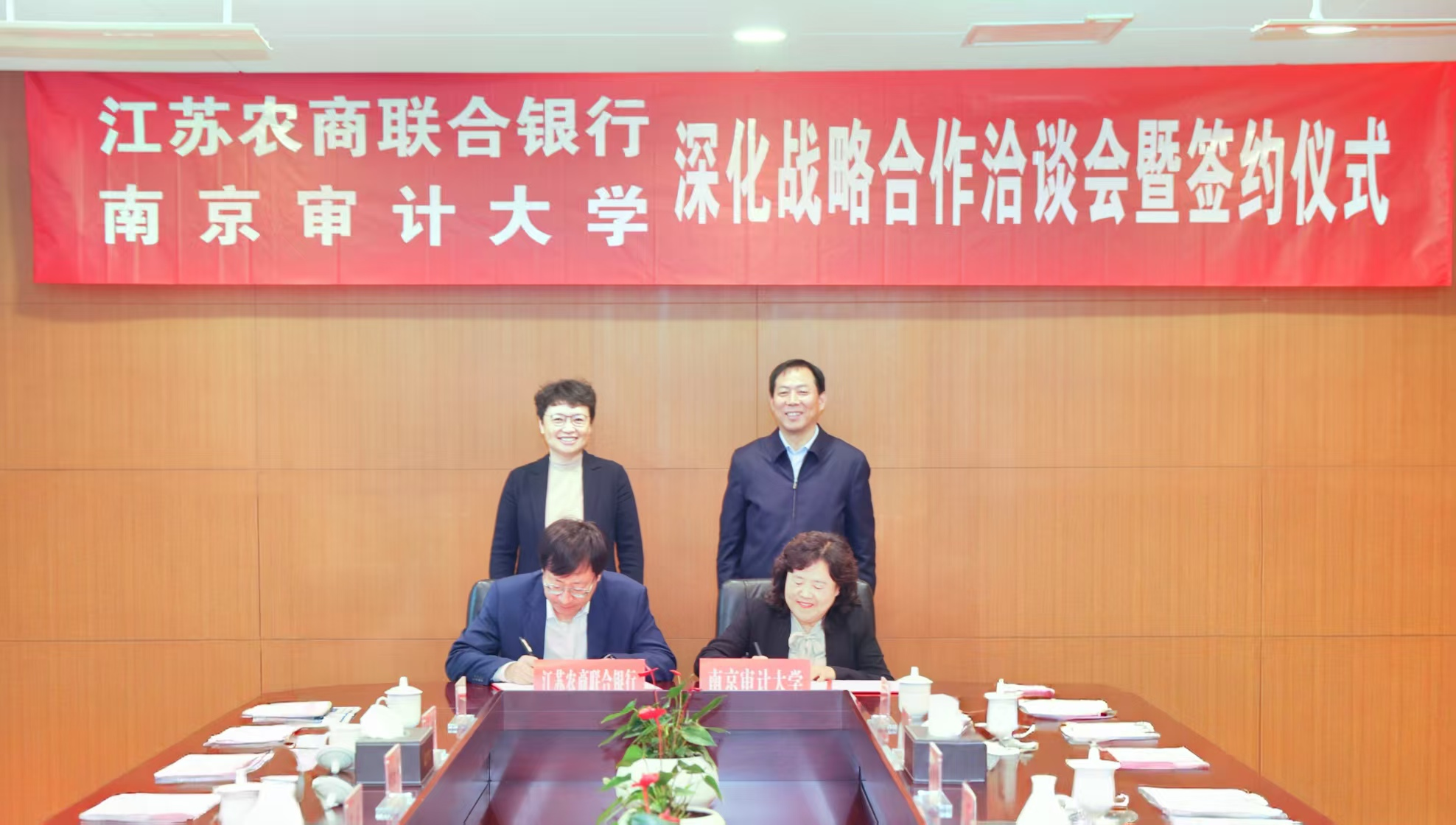 4月22日上午,南京审计大学与江苏农商联合银行深化战略合作洽谈会暨签约仪式在南京审计大学举行。江苏农商联合银行行长、党委副书记尹立鸿,副行长、党委委员李健,紫金农商银行行长、党委副书记阙正和;南京审计审计大学党委书记董必荣,党委常委、副校长卢亚娟出席会议,双方相关职能部门负责人参加会议。会议由卢亚娟主持。